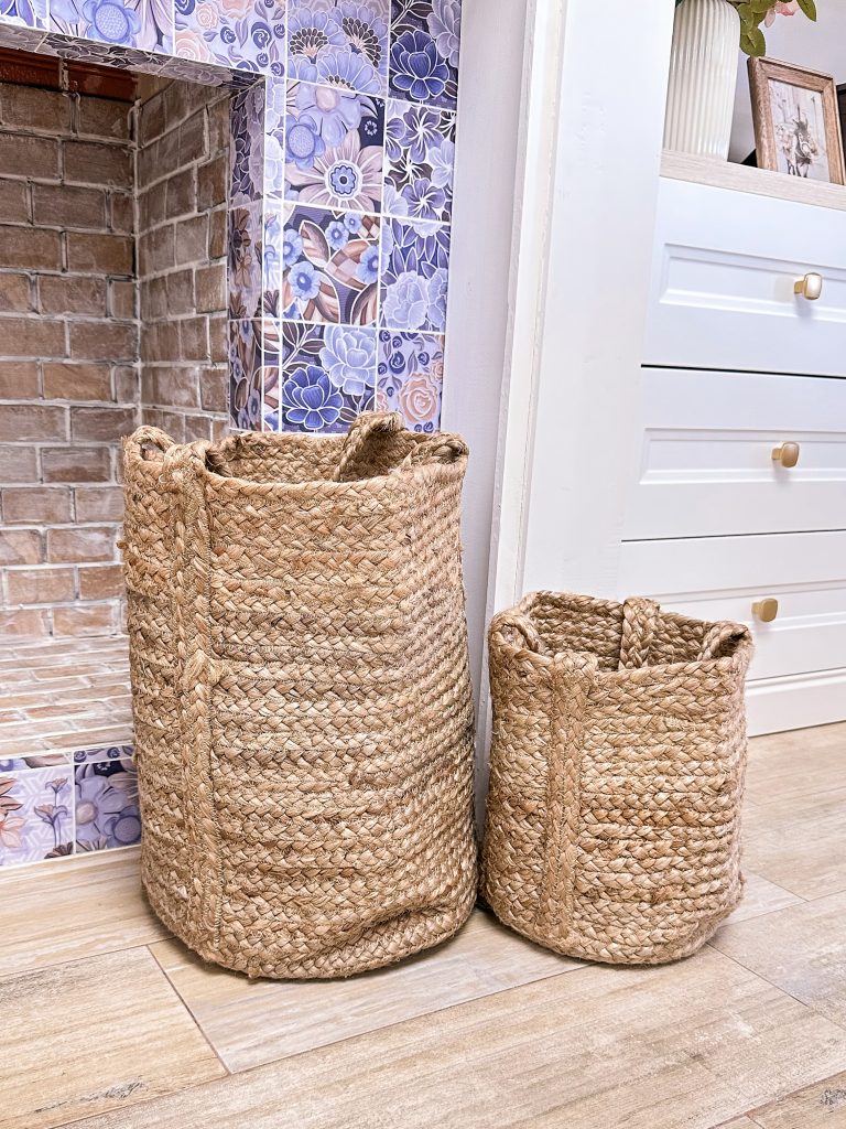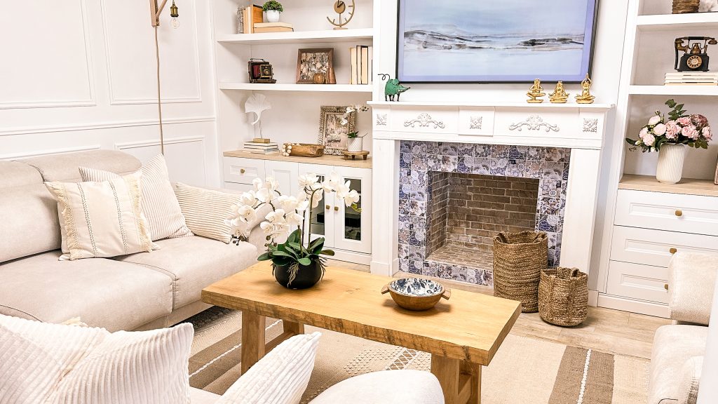 Another great idea is to use plants or flowers to add life and color to the shelves. I chose to put some beautiful flowers. Additionally, I added a neutral-toned rug (also from the same store) to give a sense of comfort and some light-colored cushions that also provide a sense of comfort. Storage baskets are an excellent idea to organize blankets and keep everything looking tidy.